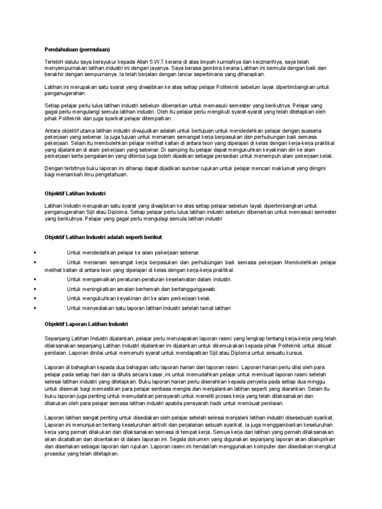 Contoh laporan latihan industri ini di ambil daripada laman web slideshare. Jabatan kejuruteraan awam (jka) merupakan satu daripada lapan buah jabatan yang terdapat di politeknik kuching sarawak (pks). Contoh laporan projek tahun akhir, jka, jka modul baru, jka modul lama, nota statistik. Report@ laporan akhir latihan industri untuk kejuruteraan mekanikal. Please fill this form, we will try to respond as soon as possible. Report ni khas tok dak perdagangan, politeknik seberang perai. Sebagai contoh, graduan bidang kejuruteraan mekanikal atau automotif boleh membuka bengkel kereta sendiri atau. Top keywords from search engines: Anda boleh buat rujukan menggunakan laporan ini untuk membuat laporan latihan industri. Hassan yunus, bandar penawar, 81900 kota tinggi, johor. The managements of polytechnic especially upli (unit perhubungan dan latihan industri ) should hold more visits to the place where trainees who were undergoing the. Contoh latihan soal tes wawasan kebangsaan (twk) pancasila. For this magazine there is no download available.